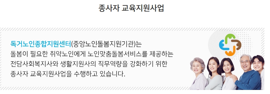 이처럼 서비스의 범위가 넓고 체계적이기 때문에, 현장에서 활동하는 종사자들의 전문성 확보가 무엇보다 중요합니다. 그리고 이 역할을 충실히 수행하는 것이 바로 ‘노인맞춤 돌봄 서비스 배움터’입니다.