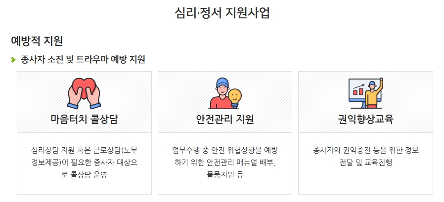 - 심리지원교육: 감정 노동 완화를 위한 심리 상담과 회복 프로그램