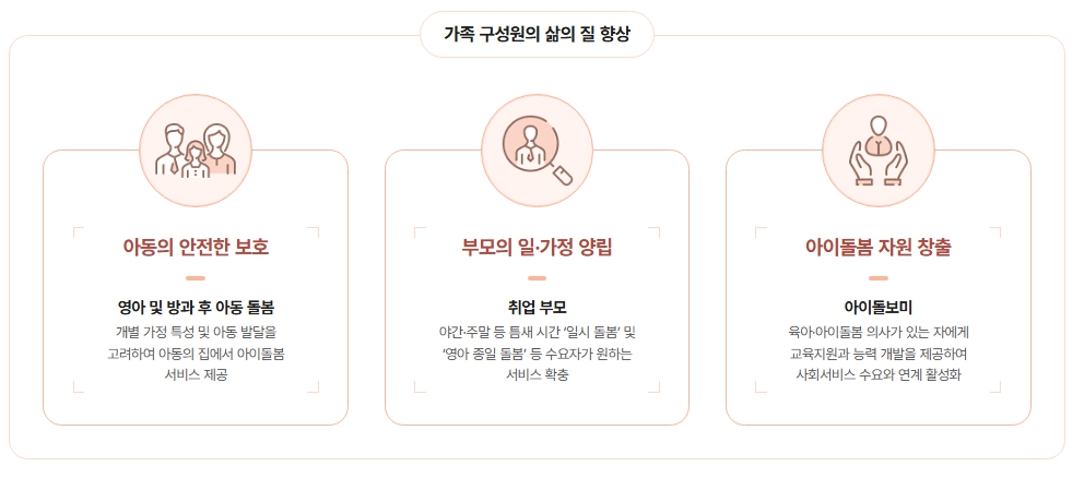 아이돌보미는 부모가 직접 돌봄을 제공하기 어려운 시간대에 가정을 방문하여 아동을 돌보는 전문 인력입니다. 등·하원 지원, 놀이 및 학습 보조, 영유아 돌봄, 질병 감염 아동 돌봄 등 다양한 유형으로 서비스가 제공됩니다. 국가가 주관하는 제도이므로 서비스 품질과 안전성이 보장된다는 점에서 신뢰도가 높습니다.