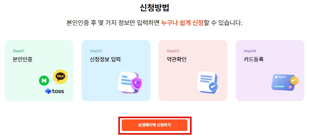 상생 페이백은 전용 누리집을 통해 신청해야 하며, 절차는 다음과 같습니다.