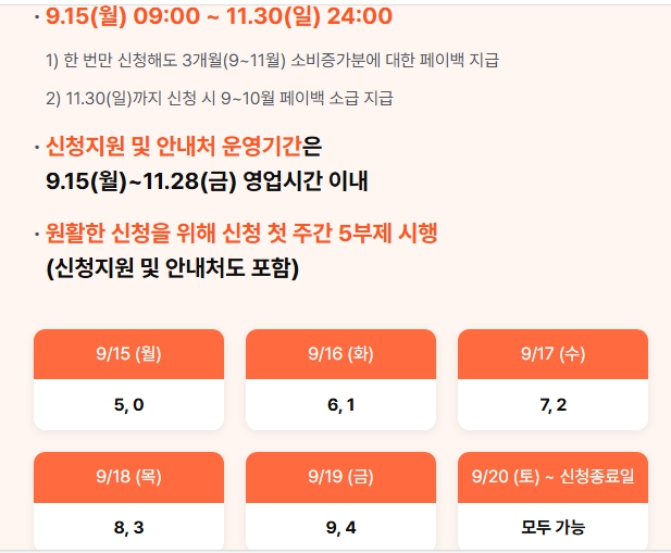 시행 초기에는 출생연도 끝자리를 기준으로 한 5부제를 운영합니다. 예를 들어 출생연도 끝자리가 1·6인 경우 월요일, 2·7인 경우 화요일에 신청하는 방식입니다. 9월 20일 이후에는 누구나 자유롭게 신청할 수 있습니다.